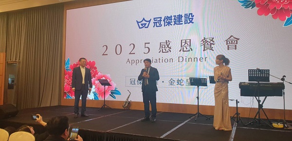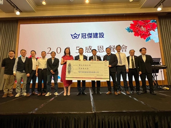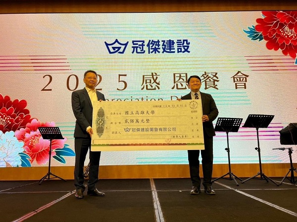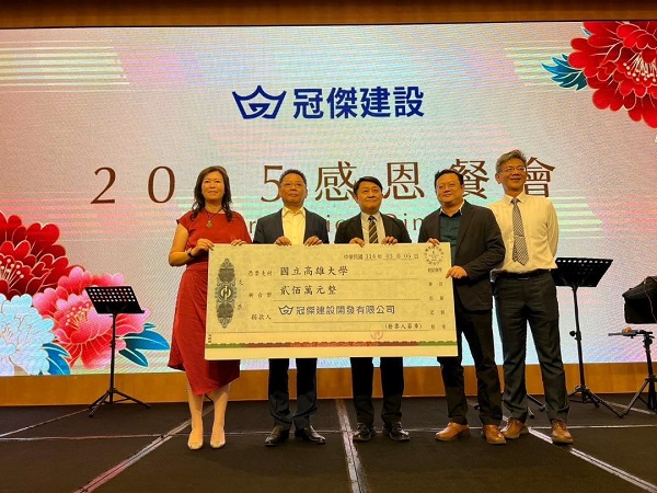 該場捐贈儀式於冠傑建設「2025感恩餐會」活動進行,高雄大學校長陳啓仁、副校長吳行浩、主任秘書潘欣泰共同出席。