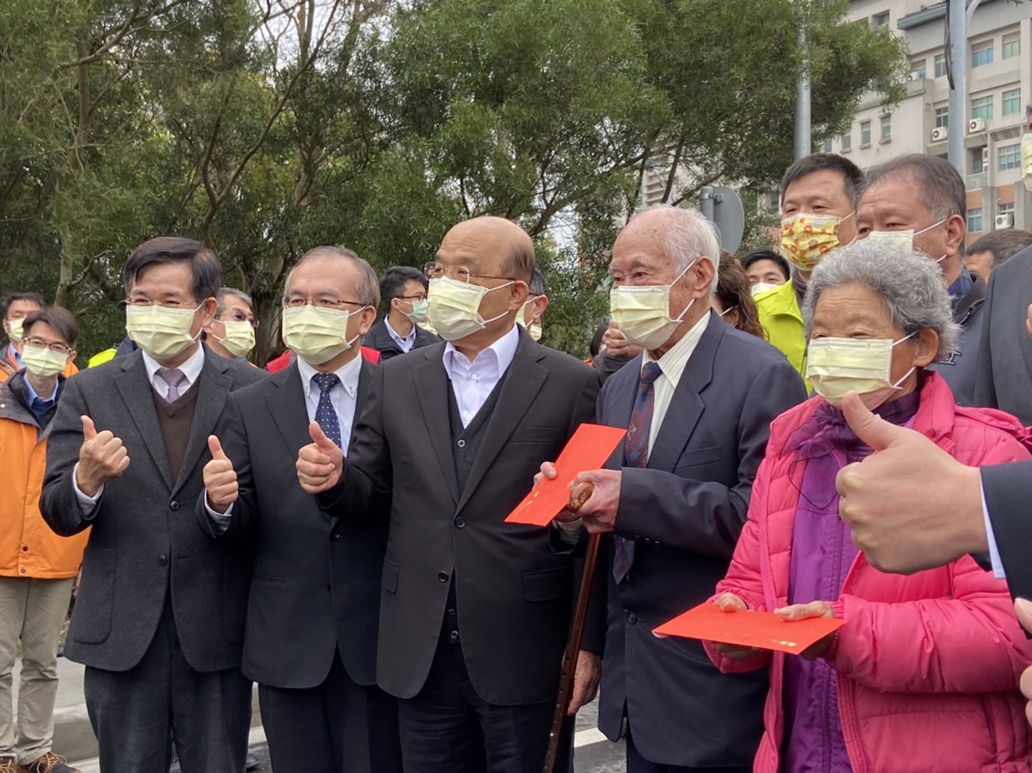 致詞結束後,蘇院長與苗栗縣府團隊及營造廠商合影留念,並與現場貴賓一同上香參拜,行三獻禮祈福通車平安,完成通車剪綵。隨後,在舞獅前導下,蘇院長與高齡99歲的壽公林江城、89歲的壽婆李申妹及現場貴賓一同踏足新路,以象徵該路段正式啟用通車。